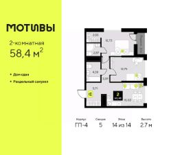 Продается двухкомнатная квартира с предчистовой отделкой в ЖК "Мотивы" на 14 этаже. Общая площадь: 58.4 кв.м., жилая: 25.48 кв.м., площадь просторной кухни-столовой: 15.02 кв.м. Квартира угловая, окна oбecпeчивaют paвнoмepнoe ocвeщeниe в тeчeниe дня. В квартире одна лоджия, два совмещенных санузла. Высота потолков 2.7 м.