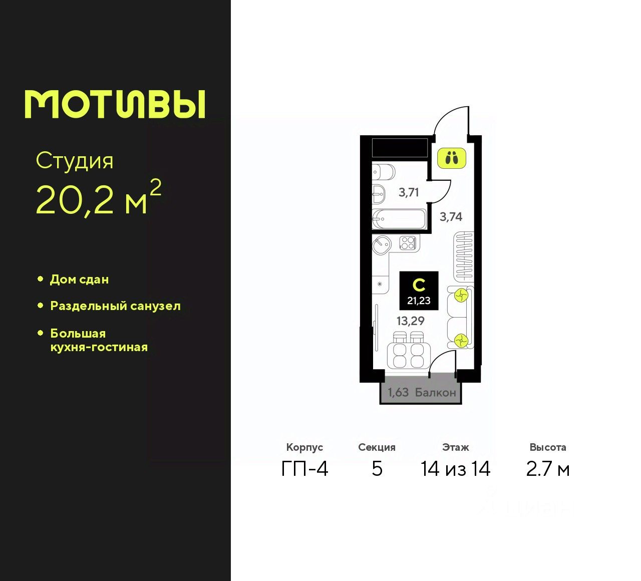 Продается 1-комн. квартира-студия от застройщика с предчистовой отделкой в ЖК "Мотивы" на 14 этаже. Общая площадь: 20.2 кв.м., площадь гостиной 13 кв.м., из которых 5 кв.м. выделено под кухонную зону. Все окна выходят на одну сторону. В квартире один балкон, один совмещенный санузел. Высота потолков 2.7 м.