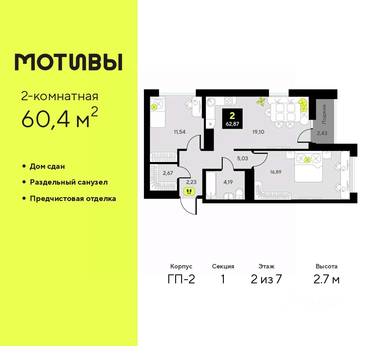 2-комн. квартира с предчистовой отделкой в ЖК "Мотивы" на 2 этаже. Общая площадь: 60.4 кв.м. Высота потолков 2.7 м.