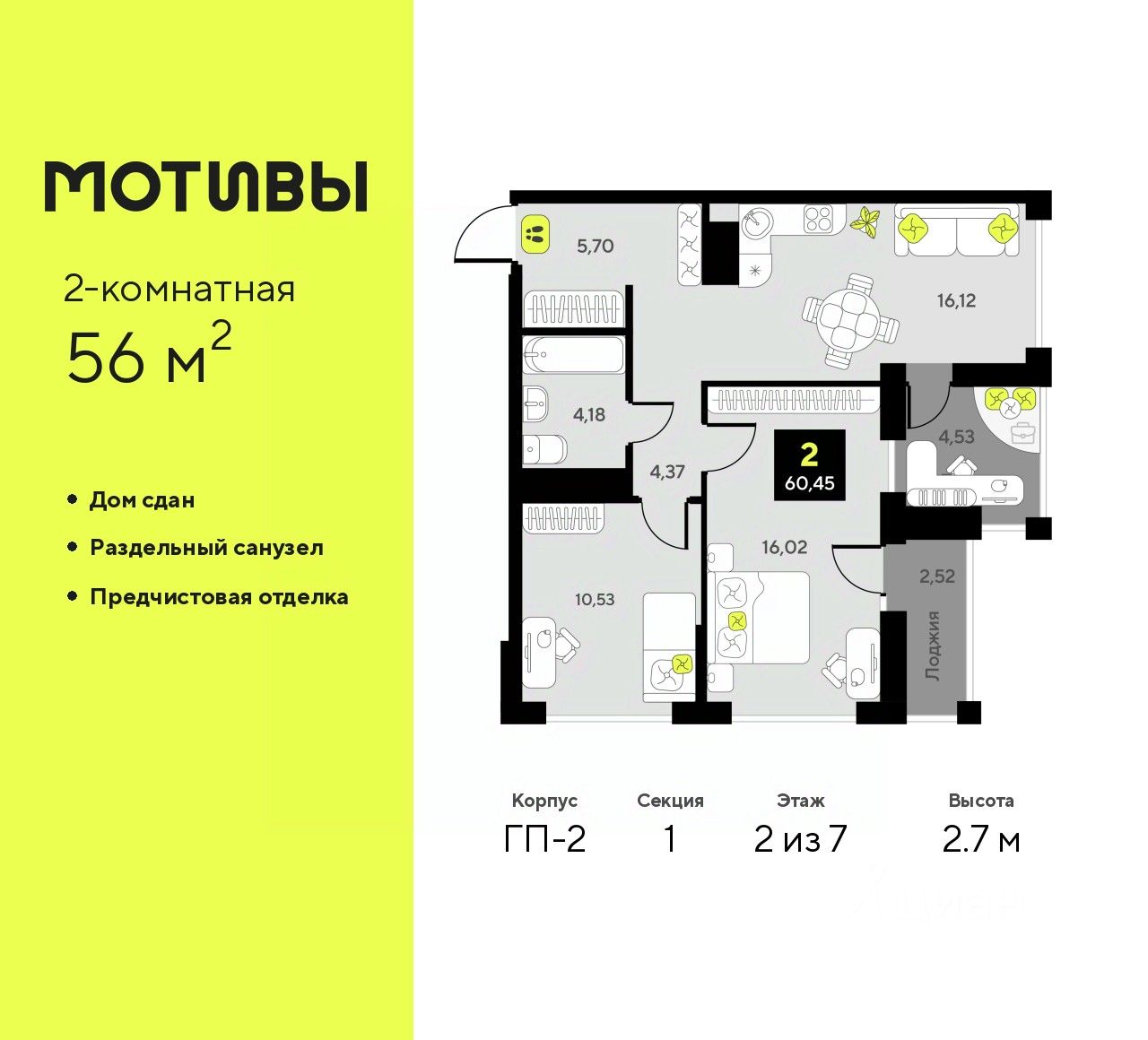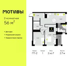 Просторная 2-комн. квартира с предчистовой отделкой в ЖК "Мотивы" на 2 этаже. Общая площадь: 56 кв.м. Высота потолков 2.7 м.