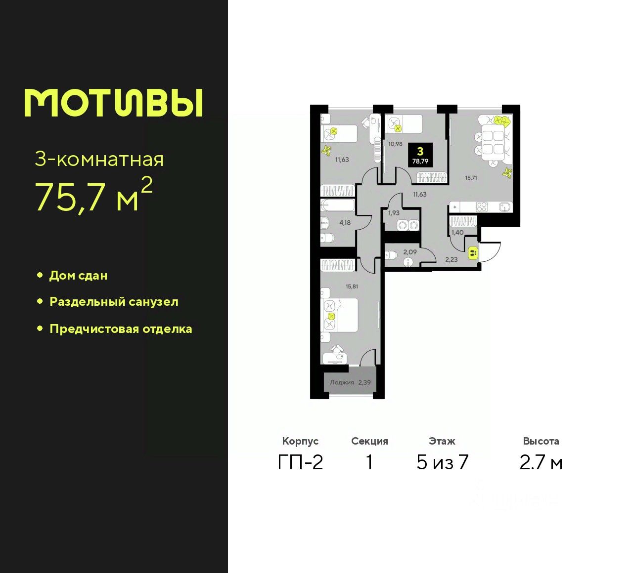Трехкомнатная квартира с предчистовой отделкой в ЖК "Мотивы" на 5 этаже. Общая площадь: 75.7 кв.м. Высота потолков 2.7 м.