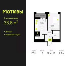 Продается 1-комн. квартира от застройщика с предчистовой отделкой в ЖК "Мотивы" на 12 этаже. Общая площадь: 33.8 кв.м., жилая: 11.6 кв.м., площадь просторной кухни-столовой: 14 кв.м. Все окна выходят на одну сторону. В квартире одна лоджия, один совмещенный санузел. Высота потолков 2.7 м.