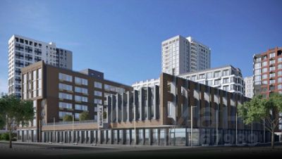 Просторная кухня-гостиная с панорамным видом на город и природу.