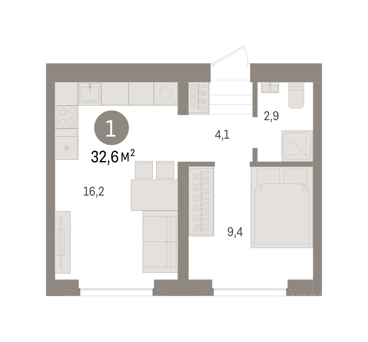Квартира с кухней-гостиной и одной спальней в жилом районе "Речной порт". Особенности планировки: предчистовая отделка.