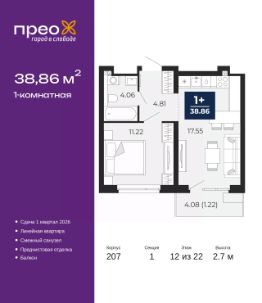 Однокомнатная квартира от застройщика с предчистовой отделкой в ЖК "Прео" на 12 этаже. Общая площадь: 38.86 кв.м., жилая: 11.22 кв.м., площадь просторной кухни-столовой: 17.55 кв.м. Все окна выходят на одну сторону. В квартире один балкон, один совмещенный санузел. Высота потолков 2.7 м.