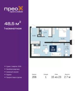 1-комн. квартира от застройщика с предчистовой отделкой в ЖК "Прео" на 15 этаже. Общая площадь: 48.5 кв.м., жилая: 12.25 кв.м., площадь просторной кухни-столовой: 20.2 кв.м. Все окна выходят на одну сторону. В квартире одна лоджия, один совмещенный санузел. Высота потолков 2.7 м.