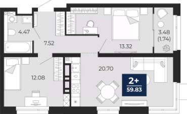 2-комн. квартира с предчистовой отделкой в ЖК "Прео" на 12 этаже. Общая площадь: 59.83 кв.м., жилая: 25.4 кв.м., площадь просторной кухни-столовой: 20.7 кв.м. Угловая квартира, идеально подойдет любителям тишины и панорамных видов. В квартире одна лоджия, один совмещенный санузел. Высота потолков 2.7 м.