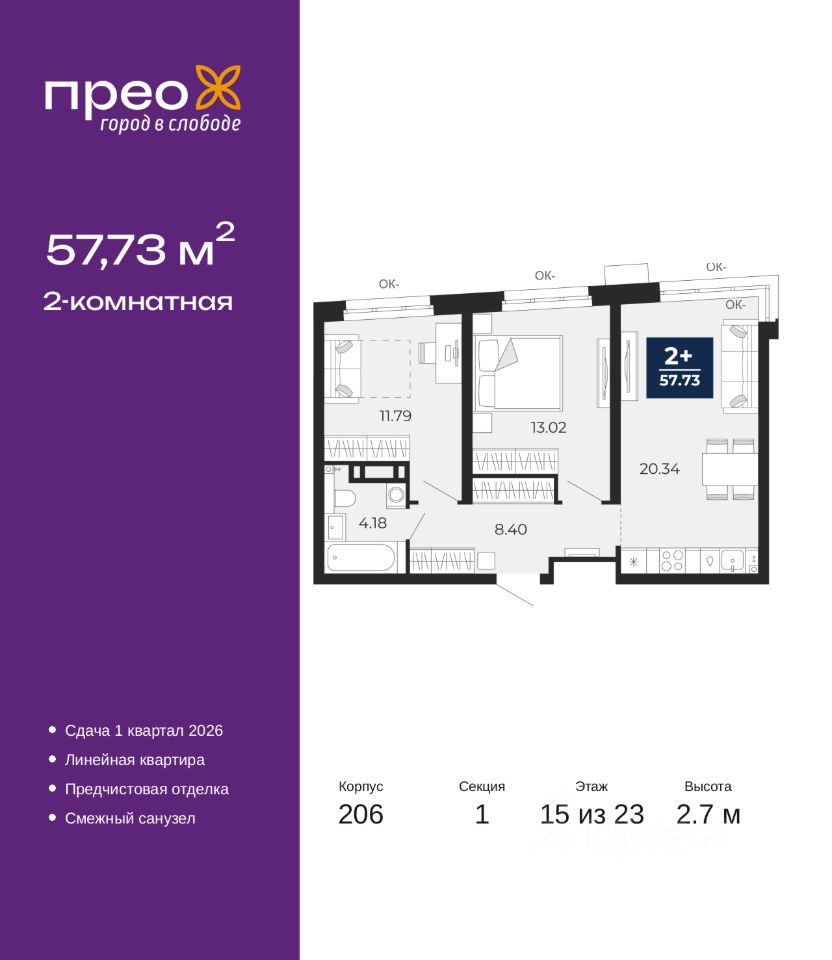 Двухкомнатная квартира с предчистовой отделкой в ЖК "Прео" на 15 этаже. Общая площадь: 57.73 кв.м., жилая: 24.81 кв.м., площадь просторной кухни-столовой: 20.34 кв.м. Комнаты изолированные, все окна выходят на одну сторону. В квартире один совмещенный санузел. Высота потолков 2.7 м.