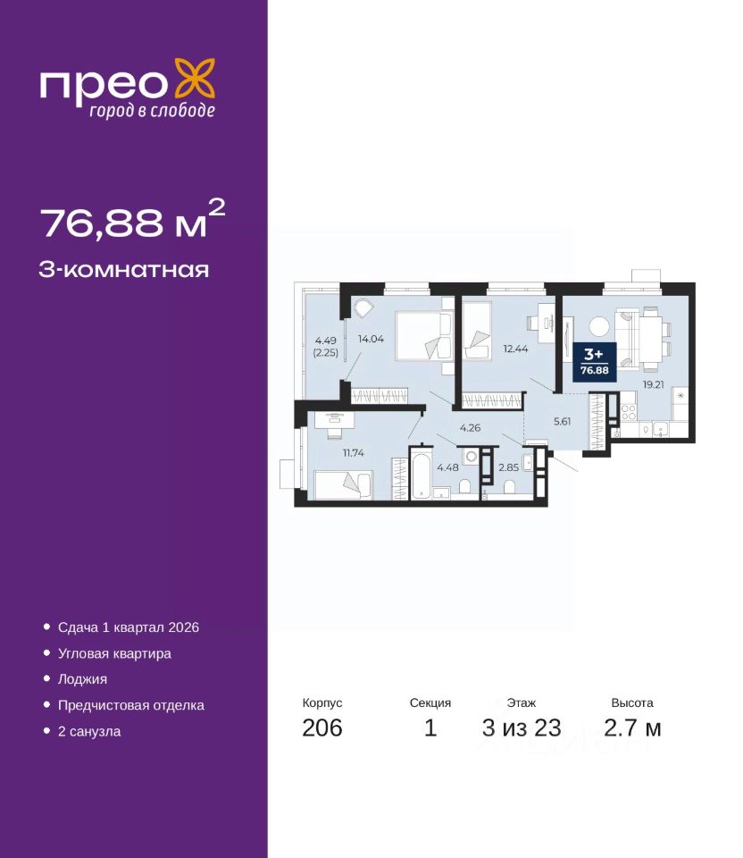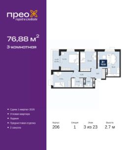 3-комн. квартира от застройщика с предчистовой отделкой в ЖК "Прео" на 3 этаже. Общая площадь: 76.88 кв.м., жилая: 38.22 кв.м., площадь просторной кухни-столовой: 19.21 кв.м. Угловая квартира, идеально подойдет любителям тишины и панорамных видов. В квартире одна лоджия, один совмещенный и один раздельный санузел. Высота потолков 2.7 м.