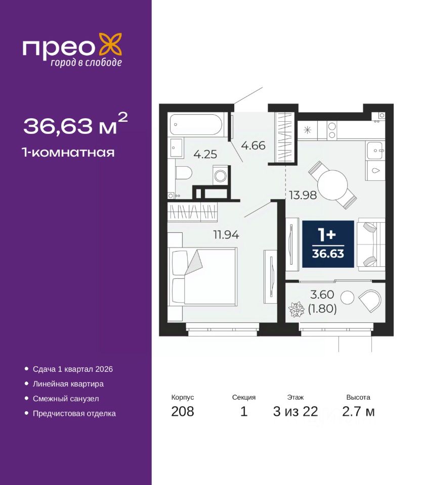 Продается 1-комн. квартира с предчистовой отделкой в ЖК "Прео" на 3 этаже. Общая площадь: 36.63 кв.м., жилая: 11.94 кв.м., площадь просторной кухни-столовой: 13.98 кв.м. Все окна выходят на одну сторону. В квартире один совмещенный санузел. Высота потолков 2.7 м.