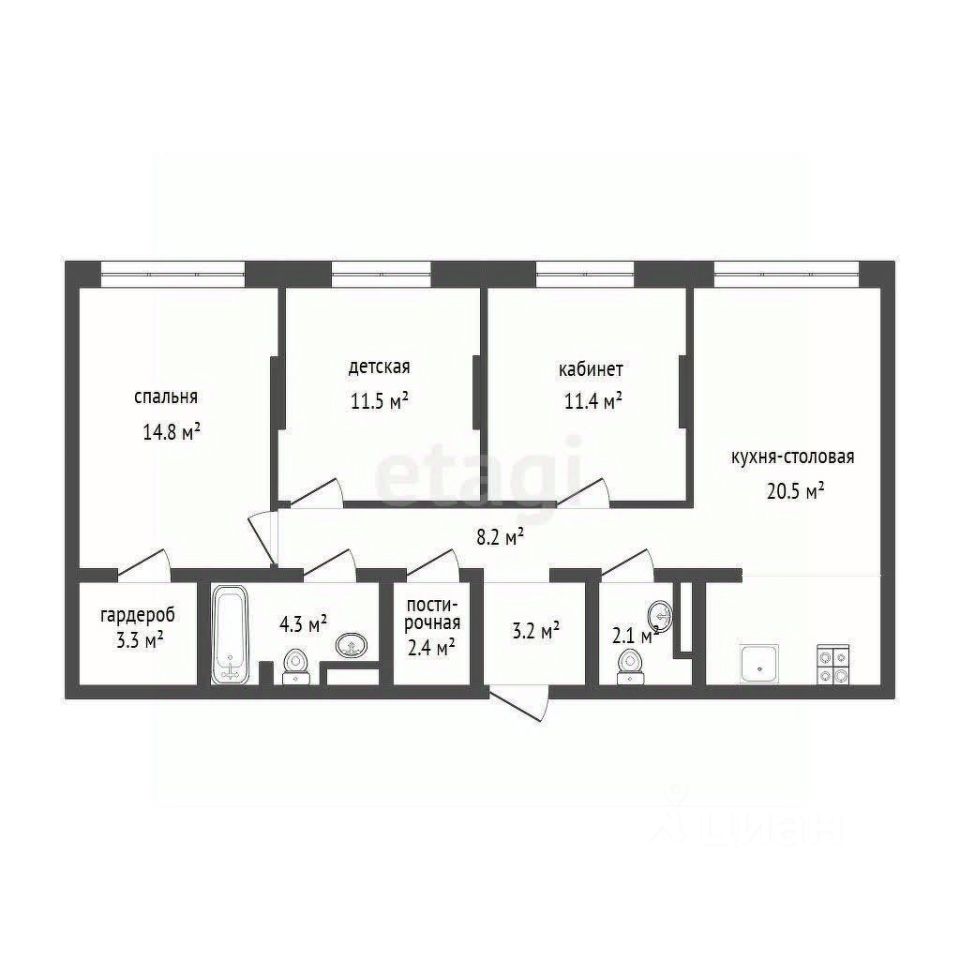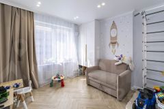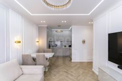 Квартира площадью 79,2 м² с продуманной европланировкой (3 комнаты + просторная кухня-гостиная) предлагается с дизайнерским ремонтом и полной комплектацией мебелью и техникой. Вся отделка выполнена с применением экологичных материалов: датская краска Flugger, бельгийские 3D-панели Orac Decor, износостойкий кварцвинил 43 класса. Кухня оборудована встроенной техникой Bosch (индукционная плита, духовой шкаф, посудомоечная машина) и холодильником Liebherr, гармонично интегрированным в мебельный гарнитур. Два санузла с авторской отделкой оснащены качественной сантехникой и мебелью на заказ.