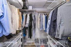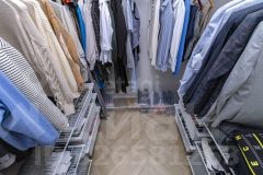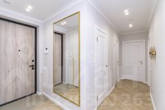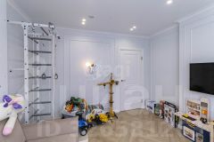 Пространство организовано с акцентом на функциональность: гардеробная система Titan GS с возможностью модернизации, постирочная с техникой LG и водонагревателем Electrolux, многочисленные встроенные системы хранения. В каждой зоне продумано освещение — от спаренной потолочной подсветки до диодных лент с регулируемой цветовой температурой. Техническое оснащение включает мультирум (4 телевизора 4K, игровая приставка, ПК), умные системы учета ресурсов и пятикамерные стеклопакеты Rehau с шумоизоляцией.