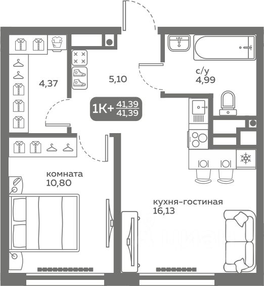 Прямая продажа от застройщика! Продается однокомнатная квартира в строящемся ЖК "Меридиан Слобода", срок сдачи: I-кв. 2027, общей площадью 41.39 м², на 18 этаже из 20. Площадь кухни — 16.13 м².