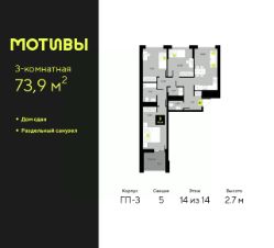 Продается 3-комн. квартира в ЖК "Мотивы" на 14 этаже. Общая площадь: 73.9 кв.м. Высота потолков 2.7 м.