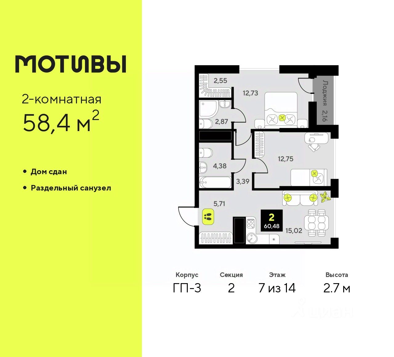 Просторная двухкомнатная квартира с предчистовой отделкой в ЖК "Мотивы" на 7 этаже. Общая площадь: 58.4 кв.м., жилая: 25.48 кв.м., площадь просторной кухни-столовой: 15.02 кв.м. Квартира угловая, очень светлая, естественная вентиляция при открытии окон. В квартире одна лоджия, два совмещенных санузла. Высота потолков 2.7 м. Квартира будет сдаваться с предчистовой отделкой White Box: выровнены и оштукатурены стены, проведено электричество и отопление, установлены радиаторы. Вы также можете приобрести квартиру с ремонтом от застройщика, представленным в трех цветовых решениях Scandi, Wood и Coffee и включающим ламинат, обои под покраску, двери, натяжной потолок и санузел с сантехникой. При желании вы можете заказать отделку под ключ, варианты возможных решений представлены в альбоме фотографий. Дом монолитный, черырехподъездный, переменной этажности, от 12 до 14 этажей. Квартира находится во 2-й секции высотой 14 этажей в корпусе ГП-3. На этаже 12 квартир. В подъезде 1 пассажирский и 1 грузовой лифт. На сегодняшний день строительство окончено, дом сдан в 4 квартале 2024 года. Оформление сделки по договору купли-продажи. Закрытая от автомобилей территория, безопасный двор и камеры видеонаблюдения - гаранты вашего спокойствия. Квартал будет располагать богатой инфраструктурой: на первых этажах разместятся магазины, пекарни, кофейни, пункты выдачи, аптеки, детские центры, цветочные салоны и многое другое, что сделает жизнь поистине комфортной. Рядом находится парк общей площадью почти 5000 м², в котором располагаются локации для игр и отдыха жителей, здесь можно совершить утреннюю пробежку или прогуляться после рабочего дня. В парке есть зона воркаута с тренажерами для взрослых, игровые комплексы с горками и канатный комплекс для детей разных возрастов, качели и лавочки для отдыха, площадки для командных видов спорта и для панна-футбола. В ЖК "Мотивы" всё продумано до мелочей: светлые холлы входных групп, оформленные в едином стиле, просторные колясочные, лапомойки для питомцев. На территории комплекса находятся 2 8-ми этажных паркинга и более 1000 м/м на открытой парковке. Жилой комплекс находится в одном из экологически благоприятных районов Тюмени, недалеко от Плехановского бора. При этом до центра города можно добраться за 15 минут, а до международного аэропорта Рощино за 13 минут. Окончание строительства: ГП 1, 2, 3, 4 сдача до конца 2024 года, ГП 6, 7, 8 сдача 2 квартал 2026 года. #zmdV68