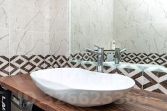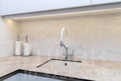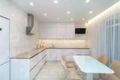 Просторная кухня-гостиная оборудована всей встроенной техникой Bosch: холодильником, варочной панелью, вытяжкой, духовым шкафом, микроволновой печью и посудомоечной машиной. Столешница выполнена из современных материалов, а обеденный стол раскладывается, обеспечивая удобство для большой семьи.