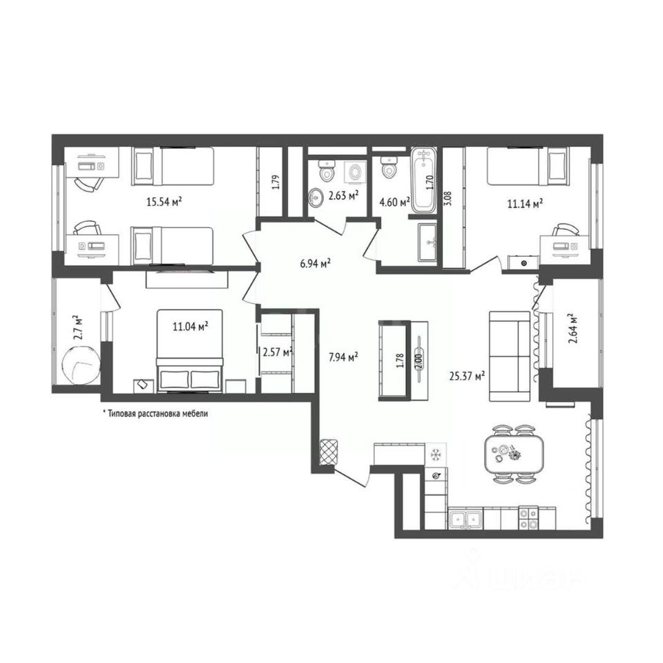 Современная планировка квартиры с двумя балконами и гардеробной.