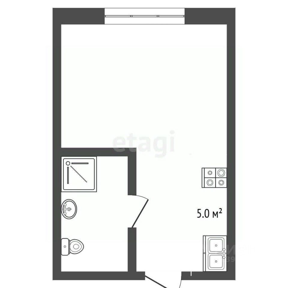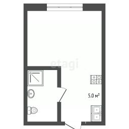 Пространство организовано рационально: гостиная-комната с выделенной кухонной зоной, коридор и отдельный санузел с душевой кабиной, унитазом и раковиной.