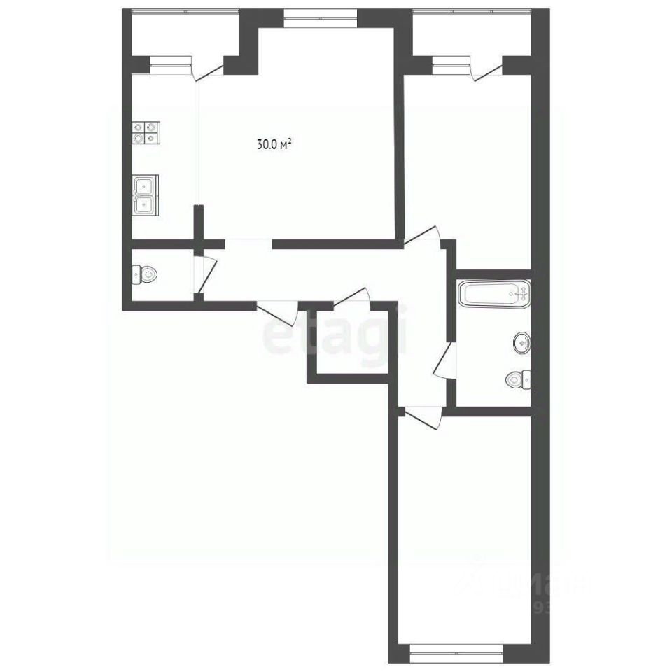 Две раздельные комнаты + просторная кухня-гостиная 30 кв.м. Просторный санузел, шикарная гардеробная комната, две лоджии по 3 м2.