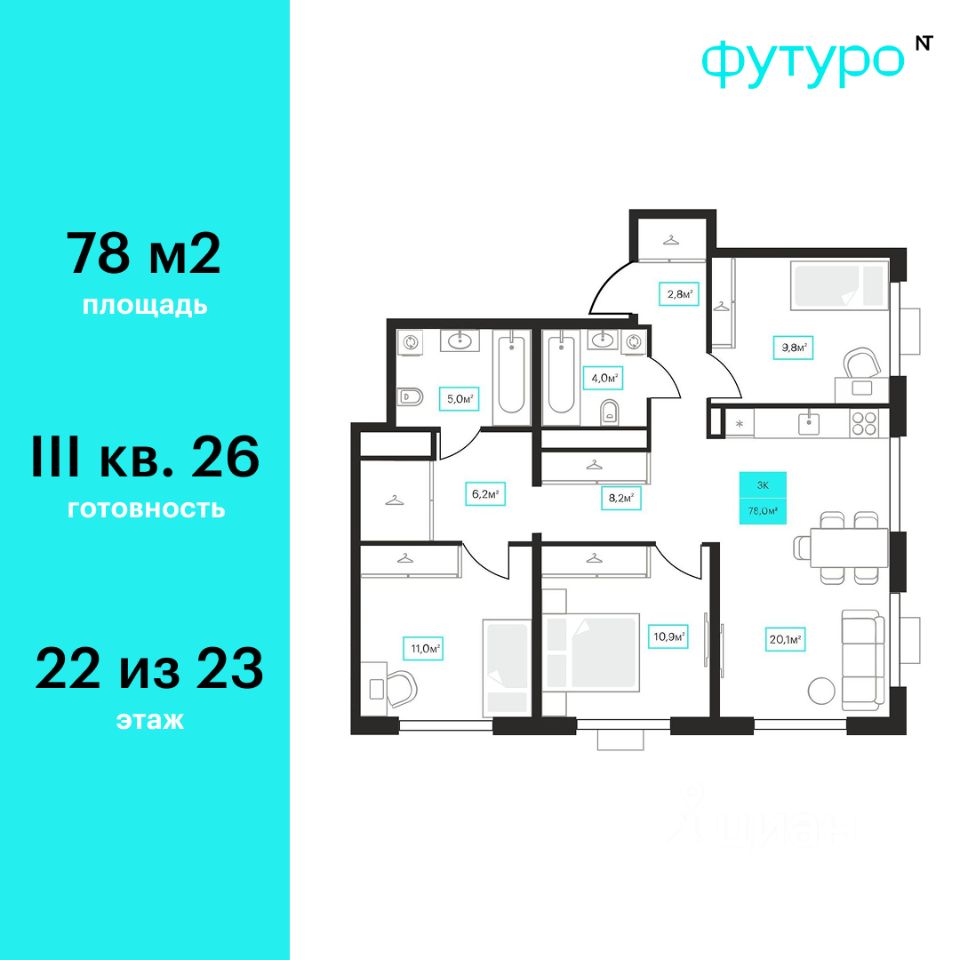 Продаётся 3-комнатная квартира в строящемся доме (Дом 6к1), срок сдачи: III-кв. 2026, общей площадью 78 кв.м., на 22 этаже. Новый жилой комплекс "Futuro" от застройщика "newton" расположен в г. Тюмень на Ставропольской улице.