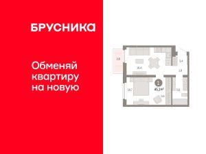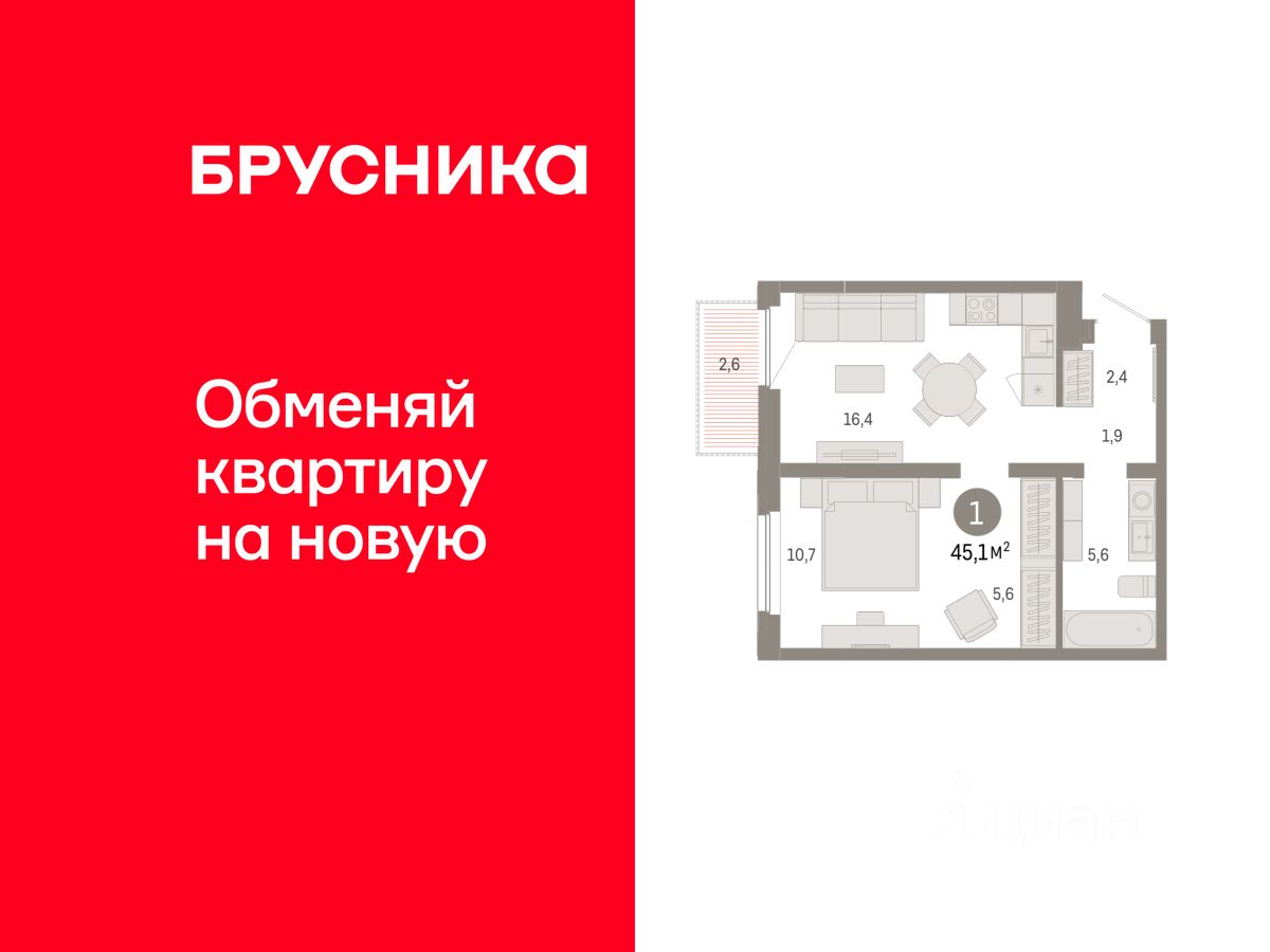1-комн. квартира с предчистовой отделкой в ЖК "Зарека" на 4 этаже. Общая площадь: 45.13 кв.м., жилая: 10.7 кв.м., площадь просторной кухни-гостиной: 16.4 кв.м. Все окна выходят на одну сторону. В квартире один балкон, один совмещенный санузел. Высота потолков 2.7 м.