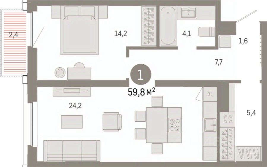 Просторная 1-комн. квартира с предчистовой отделкой в ЖК "Зарека" на 10 этаже. Общая площадь: 59.76 кв.м., жилая: 14.2 кв.м., площадь просторной кухни-гостиной: 24.2 кв.м. Все окна выходят на одну сторону. В квартире один балкон, один совмещенный санузел. Высота потолков 2.7 м.