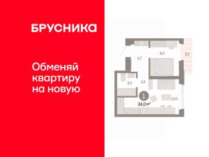 1-комн. квартира с предчистовой отделкой в ЖК "Зарека" на 7 этаже. Общая площадь: 34.03 кв.м., жилая: 8.3 кв.м., площадь просторной кухни-гостиной: 13 кв.м. Все окна выходят на одну сторону. В квартире один балкон, один совмещенный санузел. Высота потолков 2.7 м.
