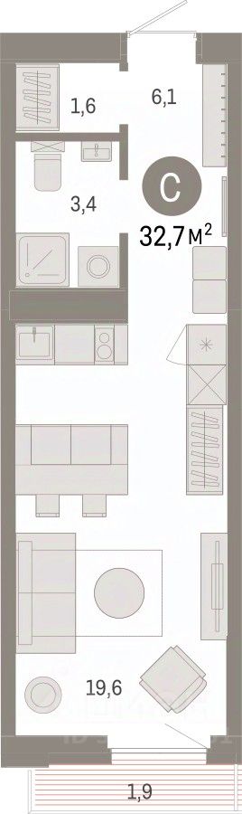 Просторная 1-комн. студия с предчистовой отделкой в ЖК "Зарека" на 10 этаже. Общая площадь: 32.72 кв.м., площадь гостиной 19.6 кв.м., из которых 5 кв.м. выделено под кухонную зону. Все окна выходят на одну сторону. В квартире один балкон, один совмещенный санузел. Высота потолков 2.7 м.