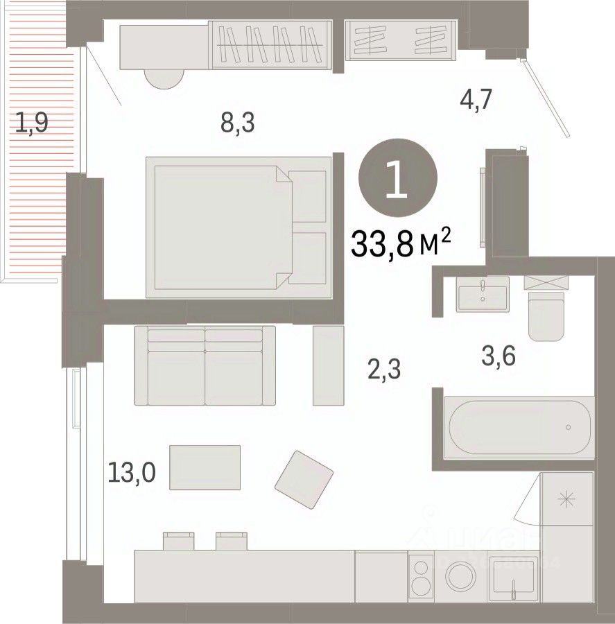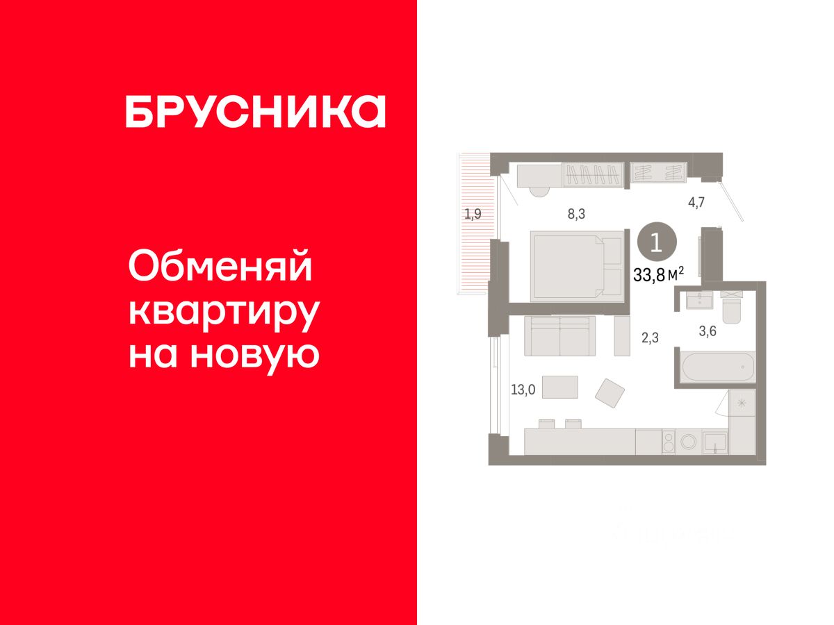 Квартира с кухней-гостиной и одной спальней в жилом районе "Зарека". Особенности планировки: балкон, предчистовая отделка.