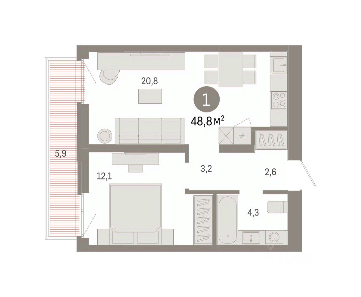 Продается однокомнатная квартира с предчистовой отделкой в ЖК "Республики 205" на 6 этаже. Общая площадь: 48.79 кв.м. Высота потолков 2.7 м.