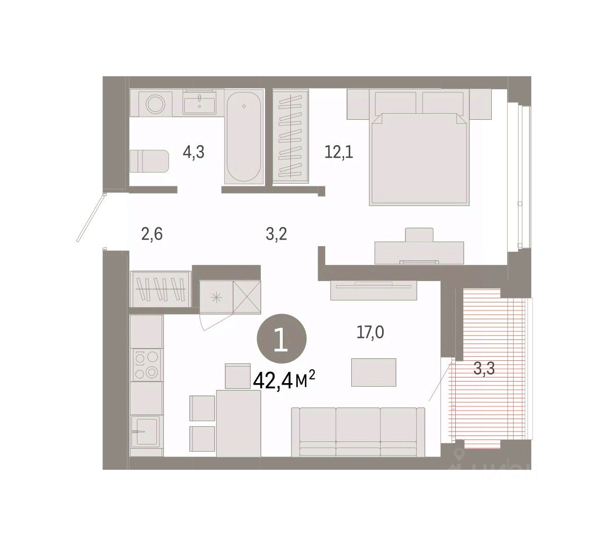 Продается однокомнатная квартира с предчистовой отделкой в ЖК "Республики 205" на 9 этаже. Общая площадь: 42.35 кв.м. Высота потолков 2.7 м.