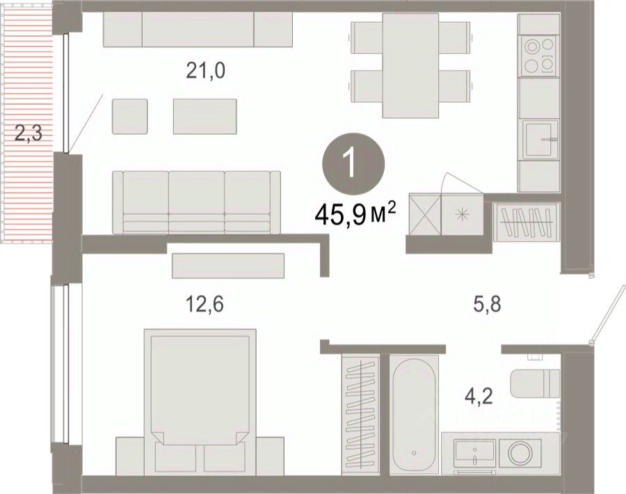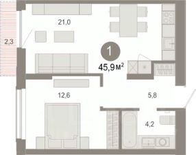 Квартира с кухней-гостиной и одной спальней в Октябрьском на Туре. Особенности планировки: балкон, предчистовая отделка.