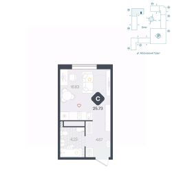 Уютная студия с просторной ванной и прихожей, в которой предусмотрена ниша для хранения. В кухне-гостиной органично зонировано пространство на нишу для приготовления, обеденную зону и место для отдыха. Подойдет для студентов и свободных молодых людей.