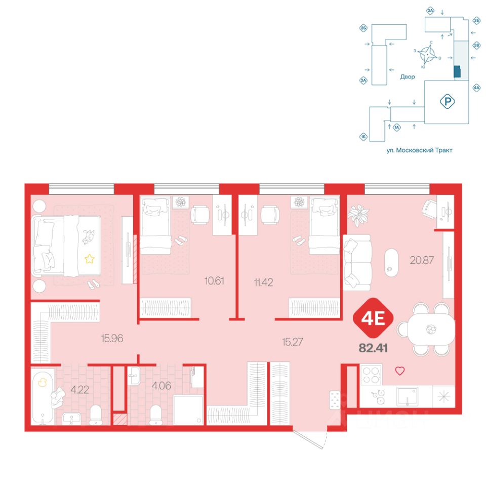 Большая четырехкомнатная квартира форматас тремя спальнями, двумя гардеробными и кухней-гостиной площадью более 20 м². Одна из спален мастер: с приватной гарлеробной и ванной комнатой. В прихожей организована ниша для хранения и выделена гардеробная. Кухня-гостиная зонирована на четыре зоны: нишу для приготовления, обеденную, гостевую и рабочую.