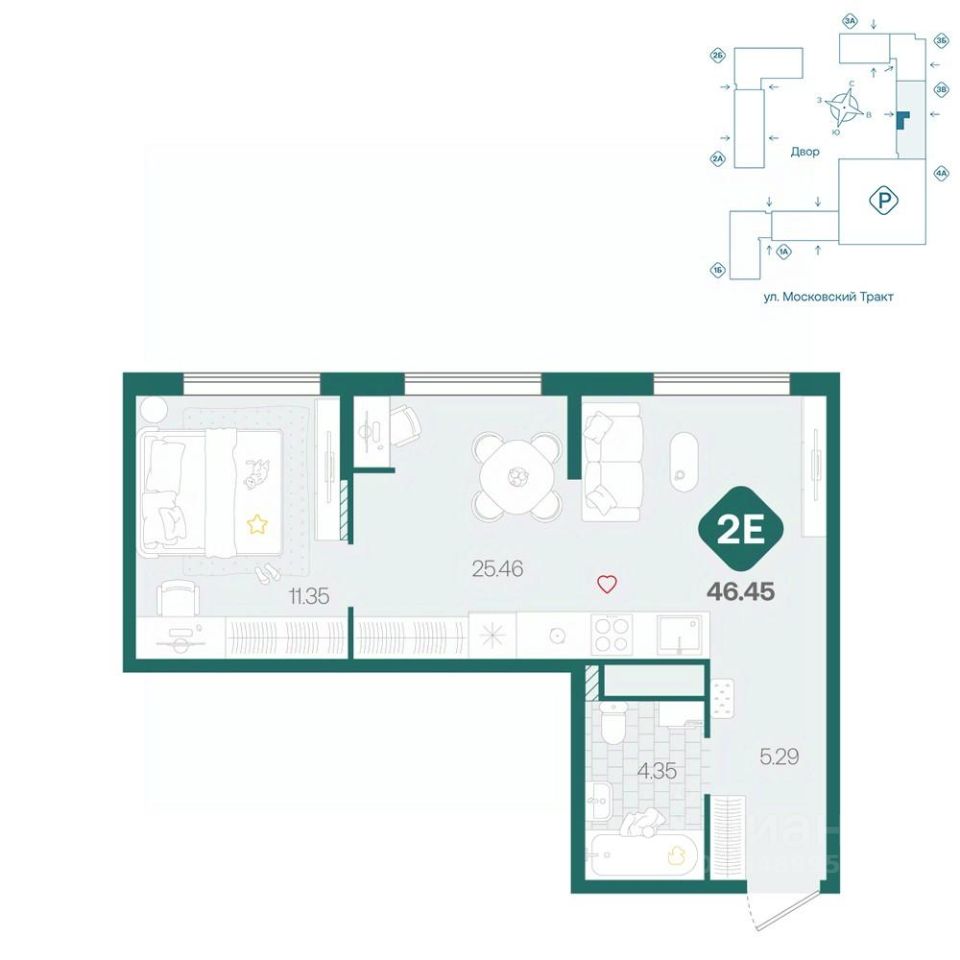 Двухкомнатная квартира с большой кухней более 25м², отдельной спальней с нишей для хранения и просторным санузлом. При входе удобная прихожая с нишей для вместительного шкафа.