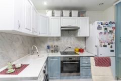 В квартире остаются: кухонный гарнитур с раковиной, керамической плитой, духовкой и вытяжкой, холодильник, плоский телевизор, плательный шкаф, карнизы.
