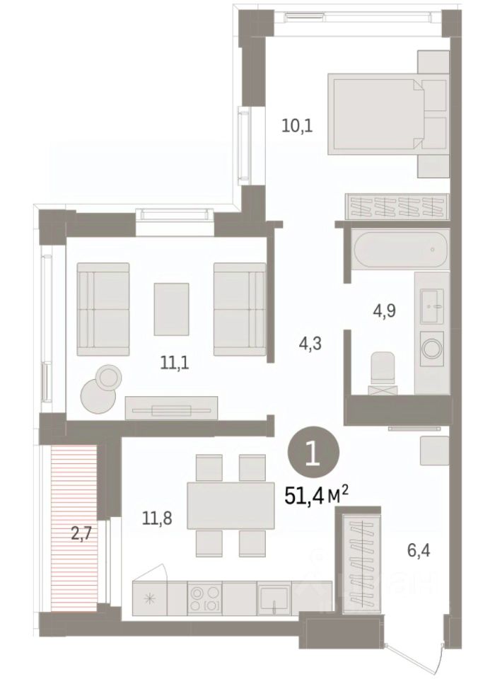 Квартира с кухней-гостиной и одной спальней в жилом районе "Зарека". Особенности планировки: предчистовая отделка, терраса на крыше.
