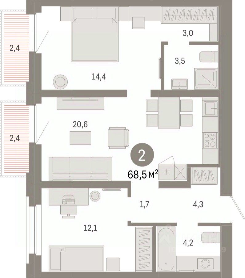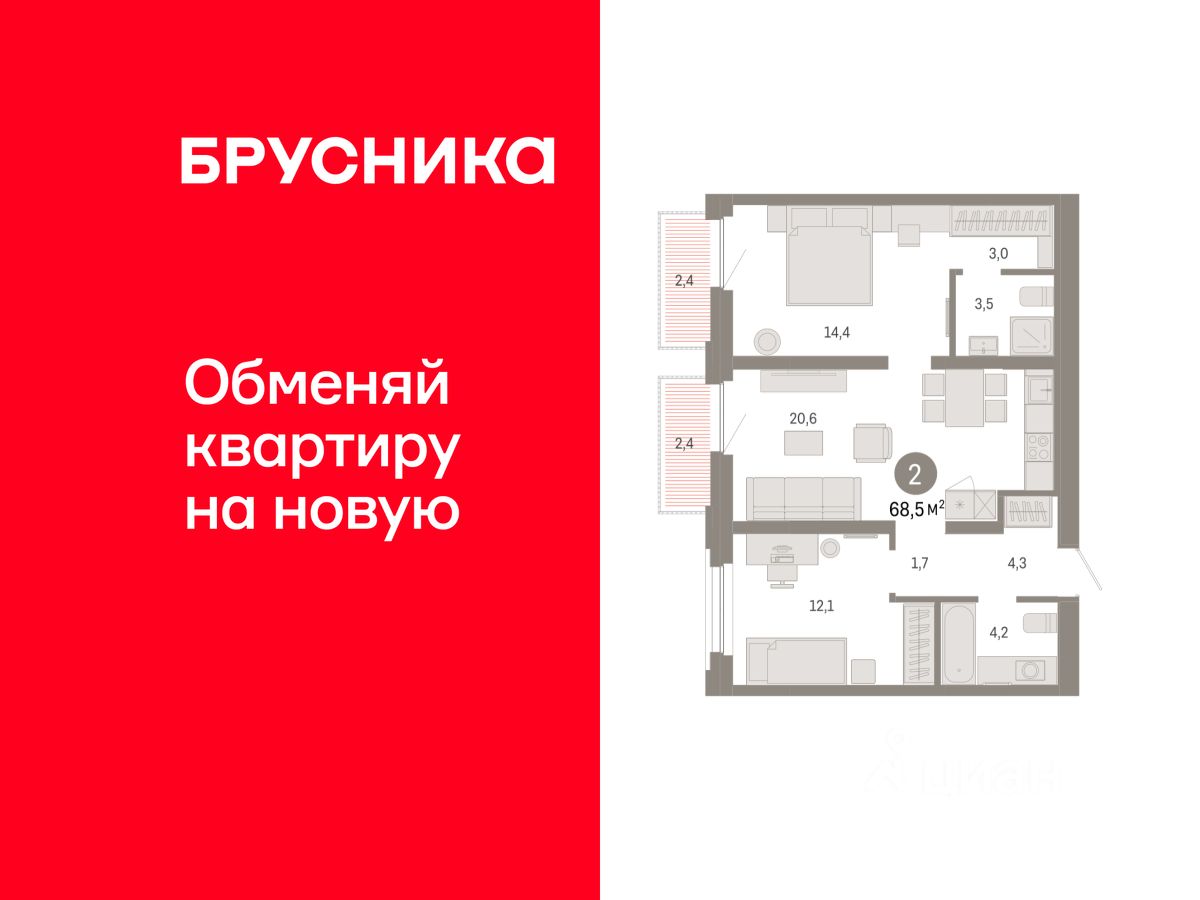 2-комн. квартира от застройщика с предчистовой отделкой в ЖК "Зарека" на 5 этаже. Общая площадь: 68.53 кв.м., жилая: 26.5 кв.м., площадь просторной кухни-гостиной: 20.6 кв.м. Комнаты изолированные, все окна выходят на одну сторону. В квартире два балкона, два совмещенных санузла. Высота потолков 2.7 м.