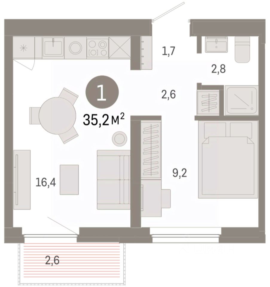 1-комн. квартира от застройщика с предчистовой отделкой в ЖК "Зарека" на 9 этаже. Общая площадь: 35.23 кв.м., жилая: 9.2 кв.м., площадь просторной кухни-гостиной: 16.4 кв.м. Все окна выходят на одну сторону. В квартире один балкон, один совмещенный санузел. Высота потолков 2.7 м.