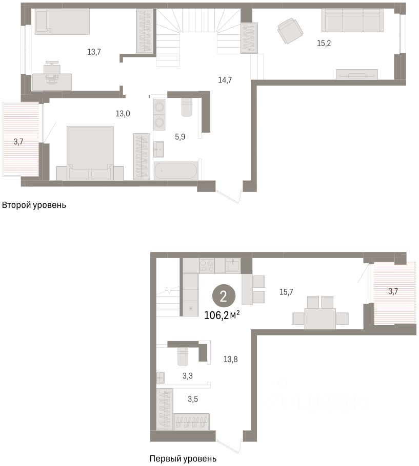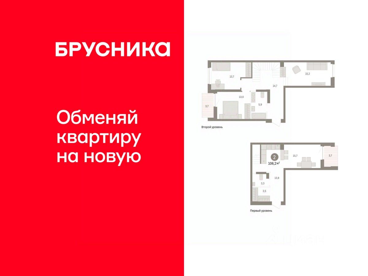 Двухуровневая квартира с кухней-гостиной и двумя спальнями в жилом районе "Речной порт". Особенности планировки: вид во двор, второй свет, двухуровневая, лоджия, потолки 3 м и выше, свободная планировка, терраса на крыше.