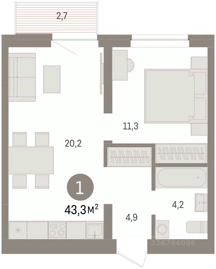 Квартира с кухней-гостиной и одной спальней в жилом районе "Речной порт". Особенности планировки: балкон, предчистовая отделка.