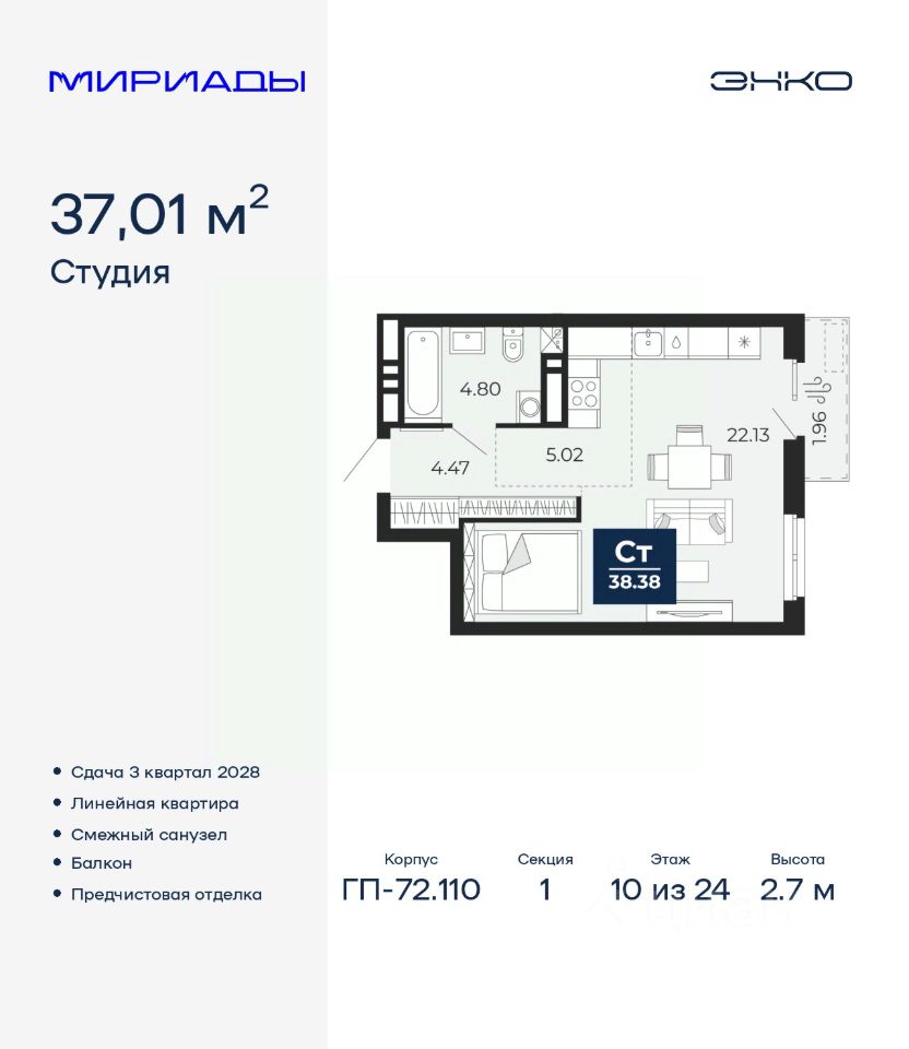 1-комн. квартира-студия с предчистовой отделкой в ЖК "Мириады" на 10 этаже. Общая площадь: 37.01 кв.м., площадь гостиной 27.15 кв.м., из которых 5.02 кв.м. выделено под кухонную зону. Все окна выходят на одну сторону. В квартире один балкон, один совмещенный санузел. Высота потолков 2.7 м.