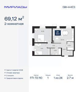 2-комн. квартира от застройщика с предчистовой отделкой в ЖК "Мириады" на 1 этаже. Общая площадь: 69.12 кв.м., жилая: 28.43 кв.м., площадь просторной кухни-столовой: 20.74 кв.м. Квартира угловая, идеально подойдет любителям тишины и панорамных видов. В квартире два совмещенных санузла. Высота потолков 2.7 м.