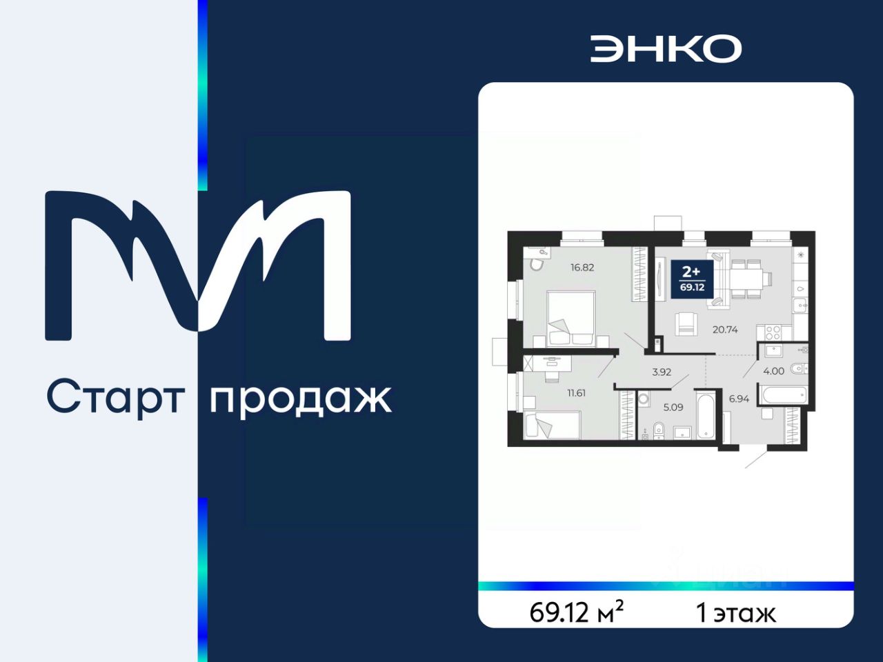 2-комн. квартира от застройщика с предчистовой отделкой в ЖК "Мириады" на 1 этаже. Общая площадь: 69.12 кв.м., жилая: 28.43 кв.м., площадь просторной кухни-столовой: 20.74 кв.м. Квартира угловая, окна oбecпeчивaют paвнoмepнoe ocвeщeниe в тeчeниe дня. В квартире два совмещенных санузла. Высота потолков 2.7 м.