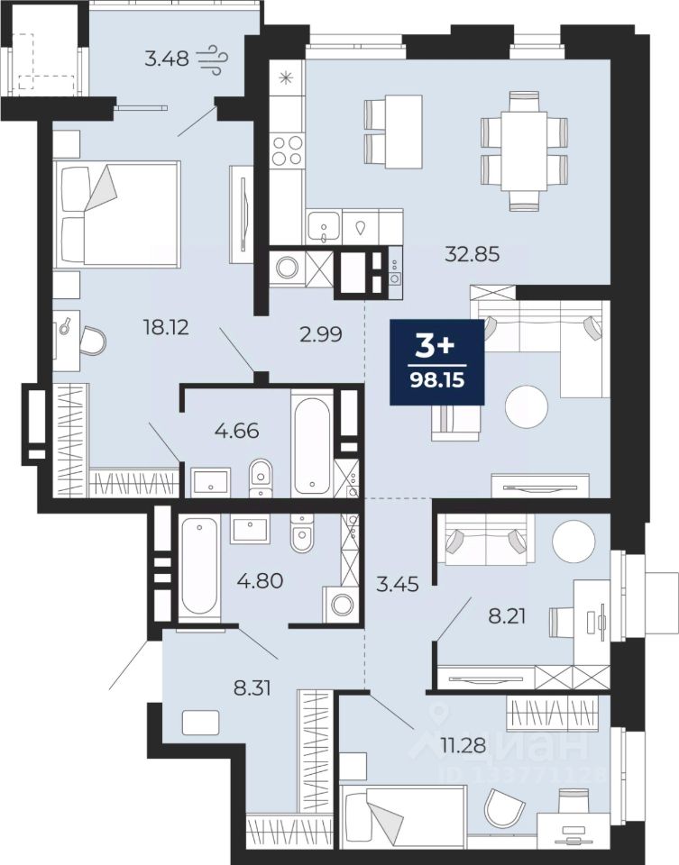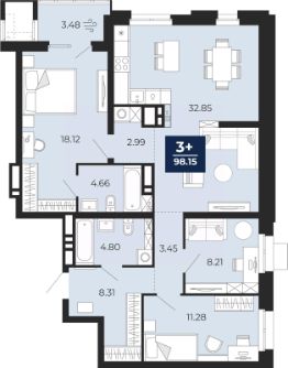 Просторная трехкомнатная квартира с предчистовой отделкой в ЖК "Мириады" на 4 этаже. Общая площадь: 95.71 кв.м., жилая: 37.61 кв.м., площадь просторной кухни-столовой: 32.85 кв.м. Квартира угловая, идеально подойдет любителям тишины и панорамных видов. В квартире одна лоджия, два совмещенных санузла. Высота потолков 2.7 м.