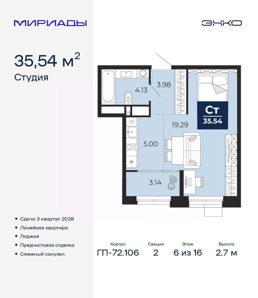 Продается 1-комн. квартира-студия с предчистовой отделкой в ЖК "Мириады" на 6 этаже. Общая площадь: 35.54 кв.м., площадь гостиной 24.29 кв.м., из которых 5 кв.м. выделено под кухонную зону. Все окна выходят на одну сторону. В квартире одна лоджия, один совмещенный санузел. Высота потолков 2.7 м.