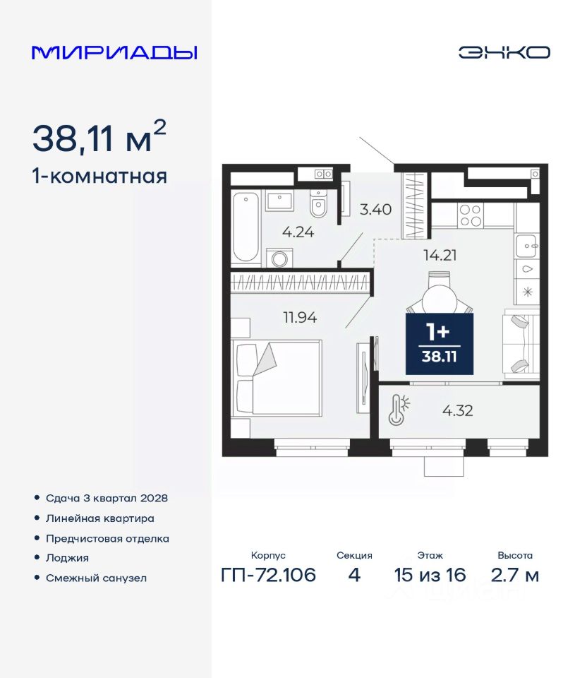 Продается однокомнатная квартира с предчистовой отделкой в ЖК "Мириады" на 15 этаже. Общая площадь: 38.11 кв.м., жилая: 11.94 кв.м., площадь просторной кухни-столовой: 14.21 кв.м. Все окна выходят на одну сторону. В квартире одна лоджия, один совмещенный санузел. Высота потолков 2.7 м.