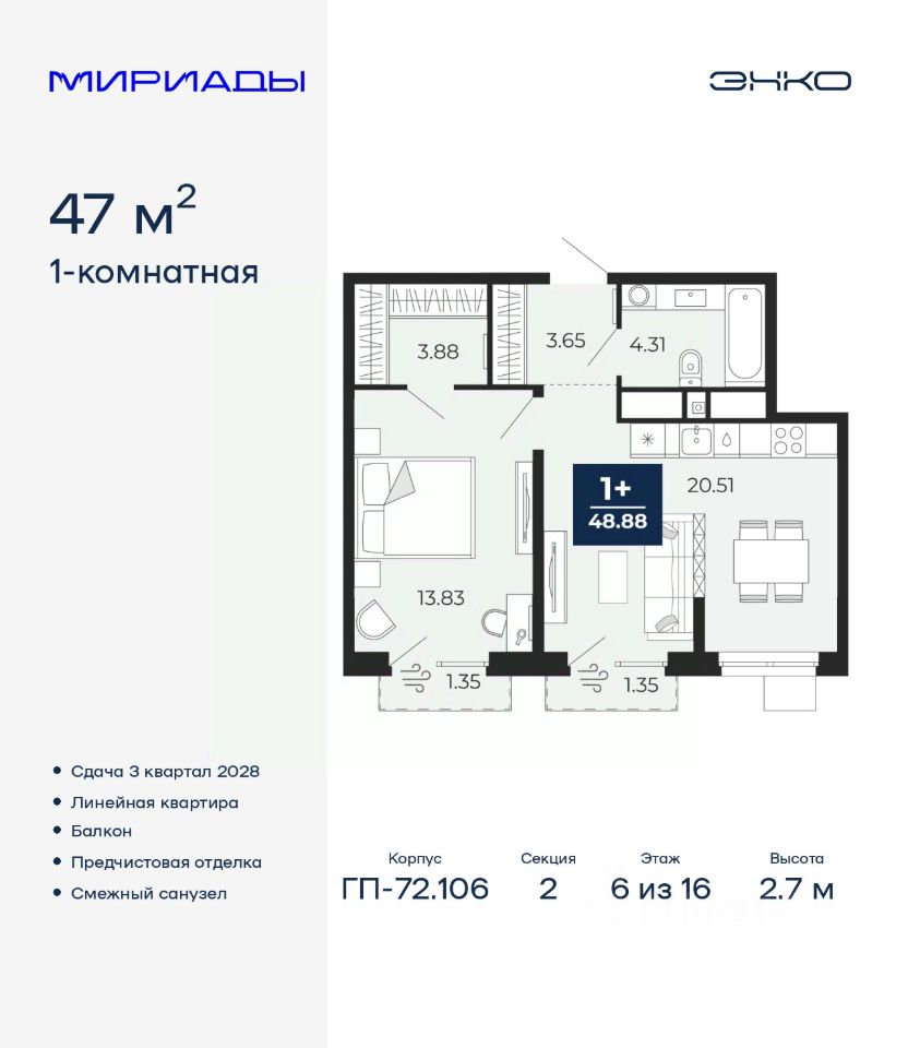 Просторная однокомнатная квартира с предчистовой отделкой в ЖК "Мириады" на 6 этаже. Общая площадь: 47 кв.м., жилая: 13.83 кв.м., площадь просторной кухни-столовой: 20.51 кв.м. Все окна выходят на одну сторону. В квартире два балкона, один совмещенный санузел. Высота потолков 2.7 м.