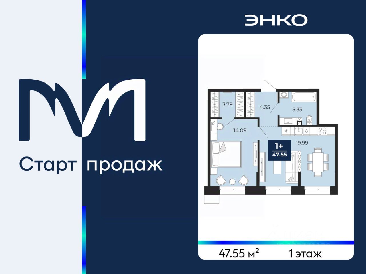 Продается однокомнатная квартира с предчистовой отделкой в ЖК "Мириады" на 1 этаже. Общая площадь: 47.55 кв.м., жилая: 14.09 кв.м., площадь просторной кухни-столовой: 19.99 кв.м. Все окна выходят на одну сторону. В квартире один совмещенный санузел. Высота потолков 2.7 м.
