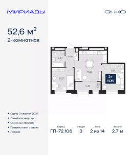Просторная 2-комн. квартира с предчистовой отделкой в ЖК "Мириады" на 2 этаже. Общая площадь: 52.6 кв.м., жилая: 22.12 кв.м., площадь просторной кухни-столовой: 17.65 кв.м. Комнаты изолированные, все окна выходят на одну сторону. В квартире одна лоджия, один совмещенный санузел. Высота потолков 2.7 м.